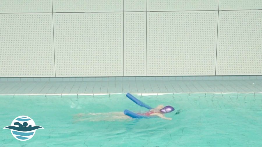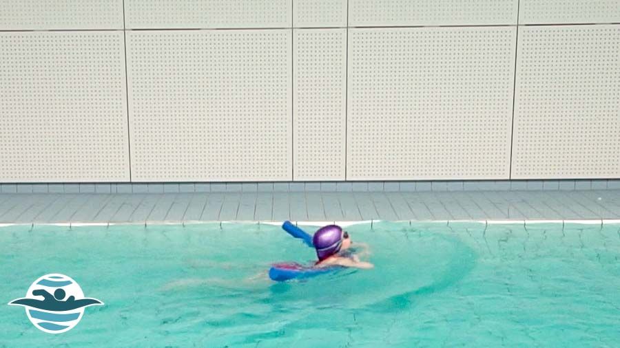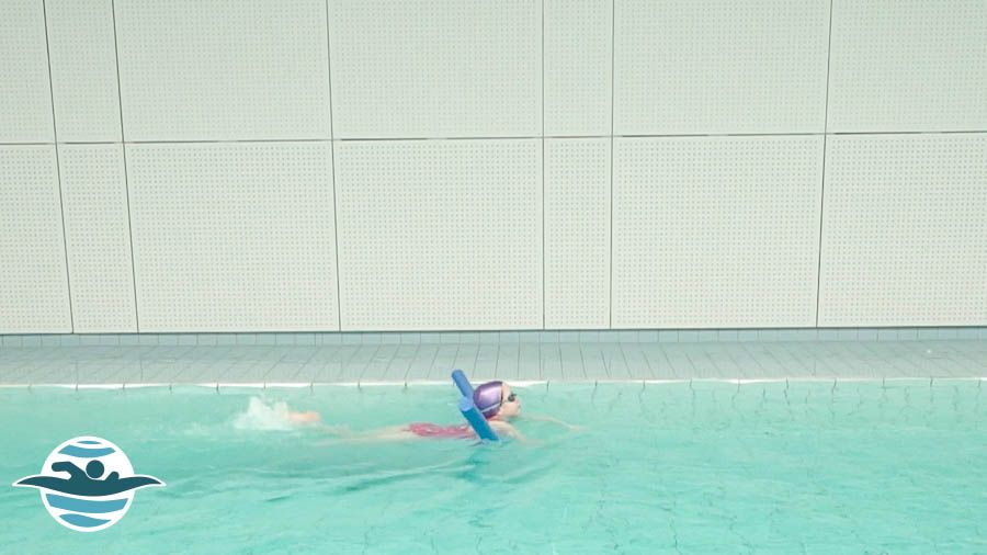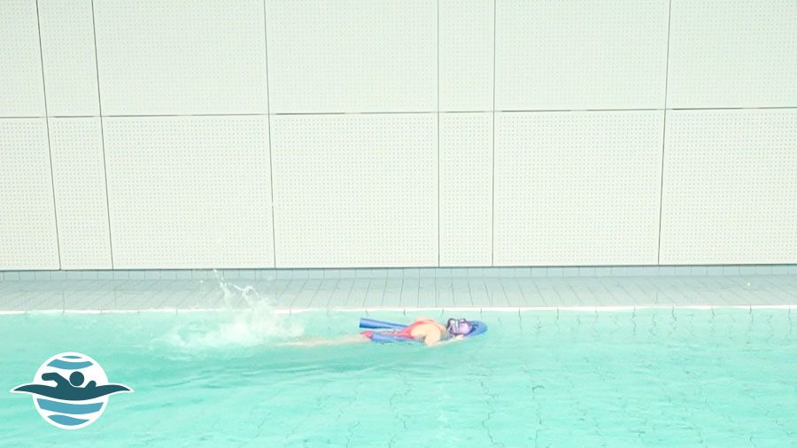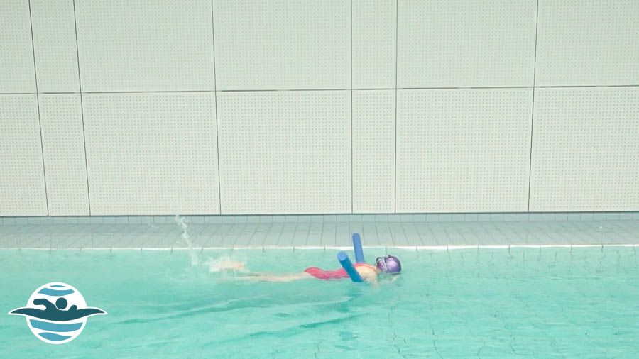 Elternteil zieht aus dem Stand mit Schwimmnudel in Bauchlage (es spürt, dass die Beine in der Fortbewegung auftreiben)